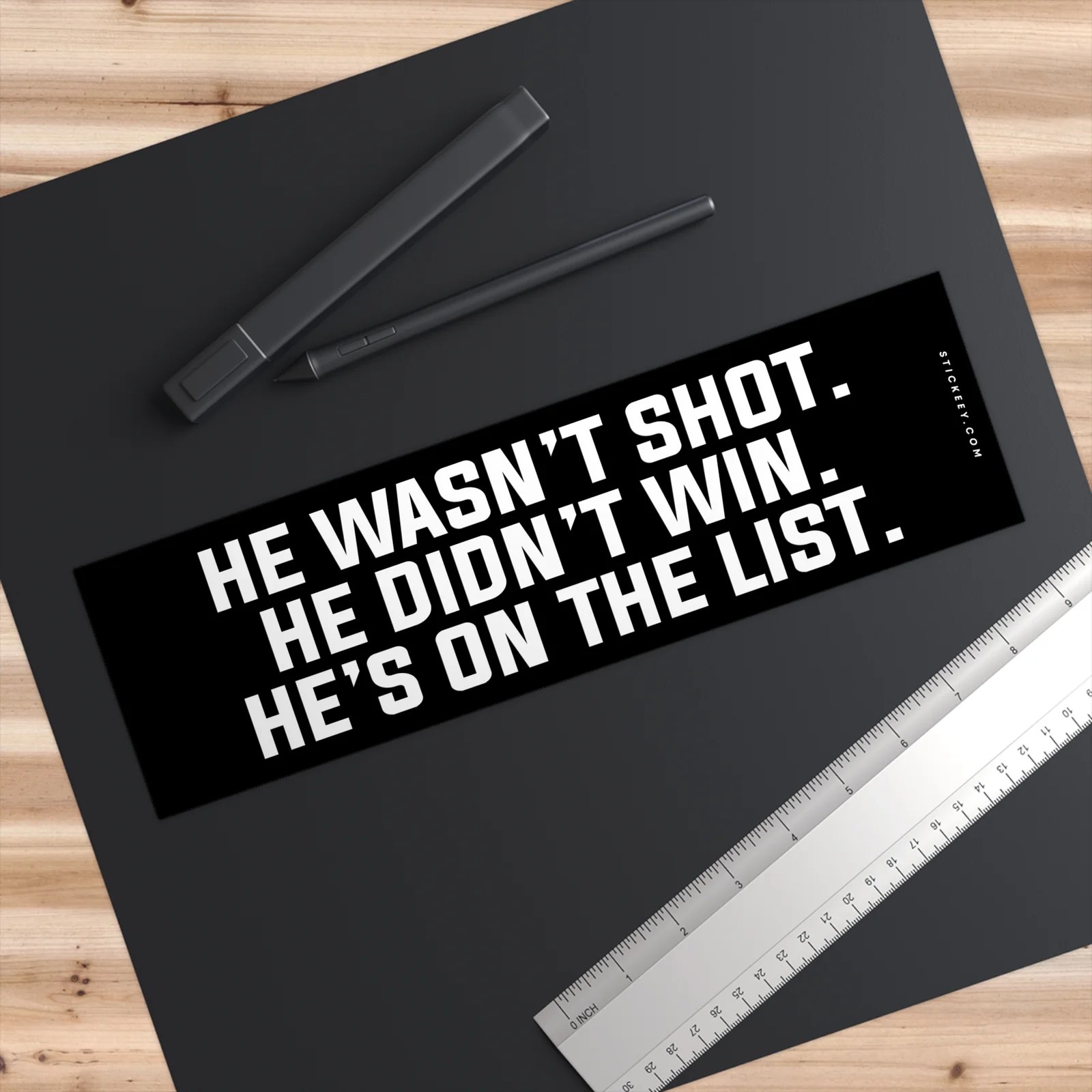 He Wasn’t Shot. He Didn’t Win. He’s On The List. – Anti‑Trump Political Bumper Sticker