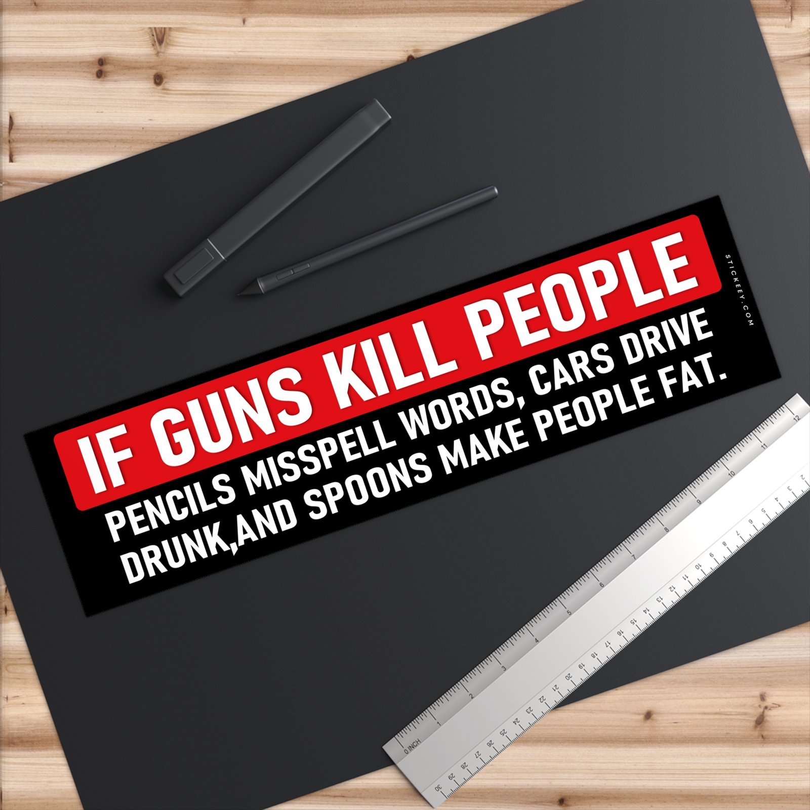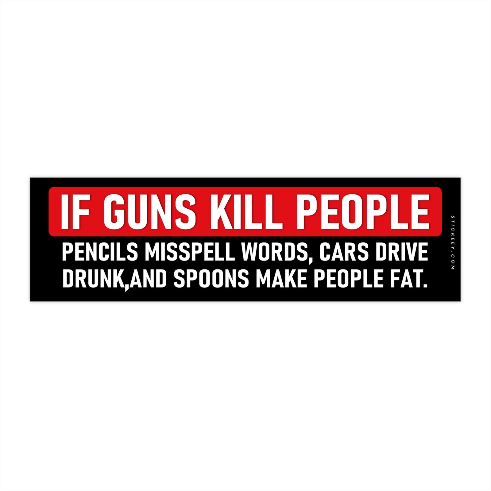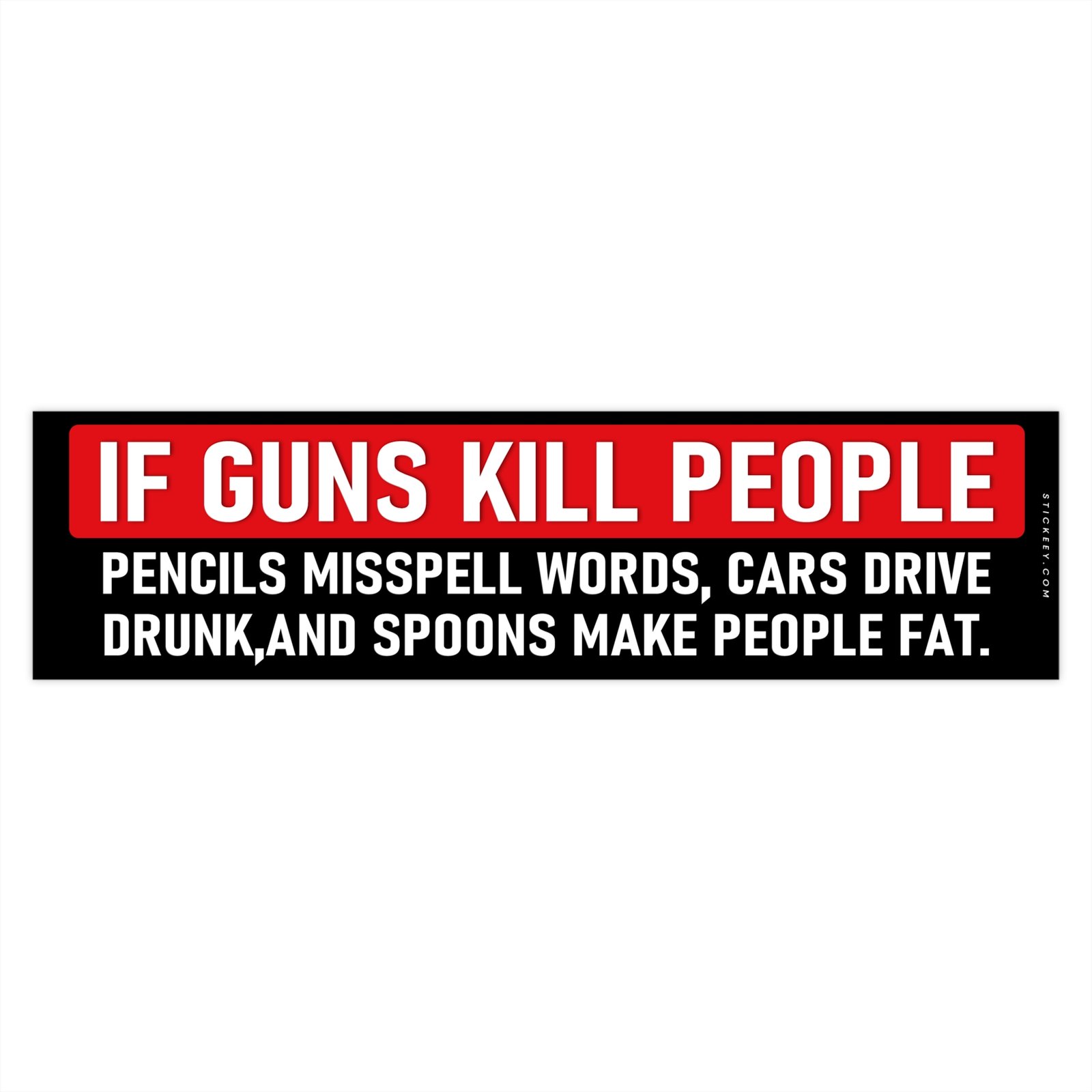 This “If Guns Kill People” bumper sticker uses blunt dark humor to challenge the argument with a sarcastic comparison: pencils misspell words, cars drive drunk, and spoons make people fat. The bold message stands out on any car, truck, or SUV and sparks conversation wherever you park. Printed on durable weatherproof vinyl that resists rain, sun, and car washes. Designed for drivers who like sharp political humor and unapologetic statements on the road.