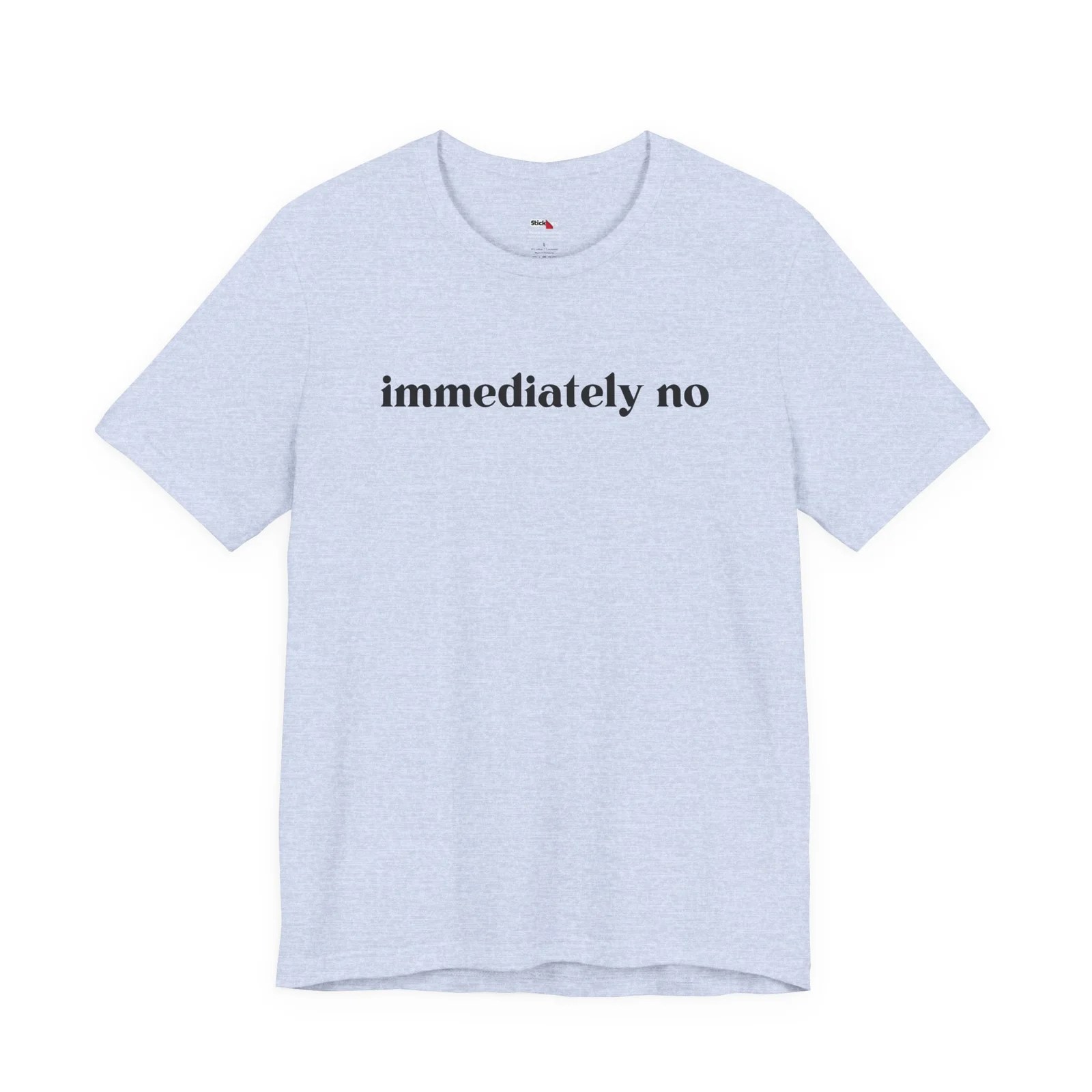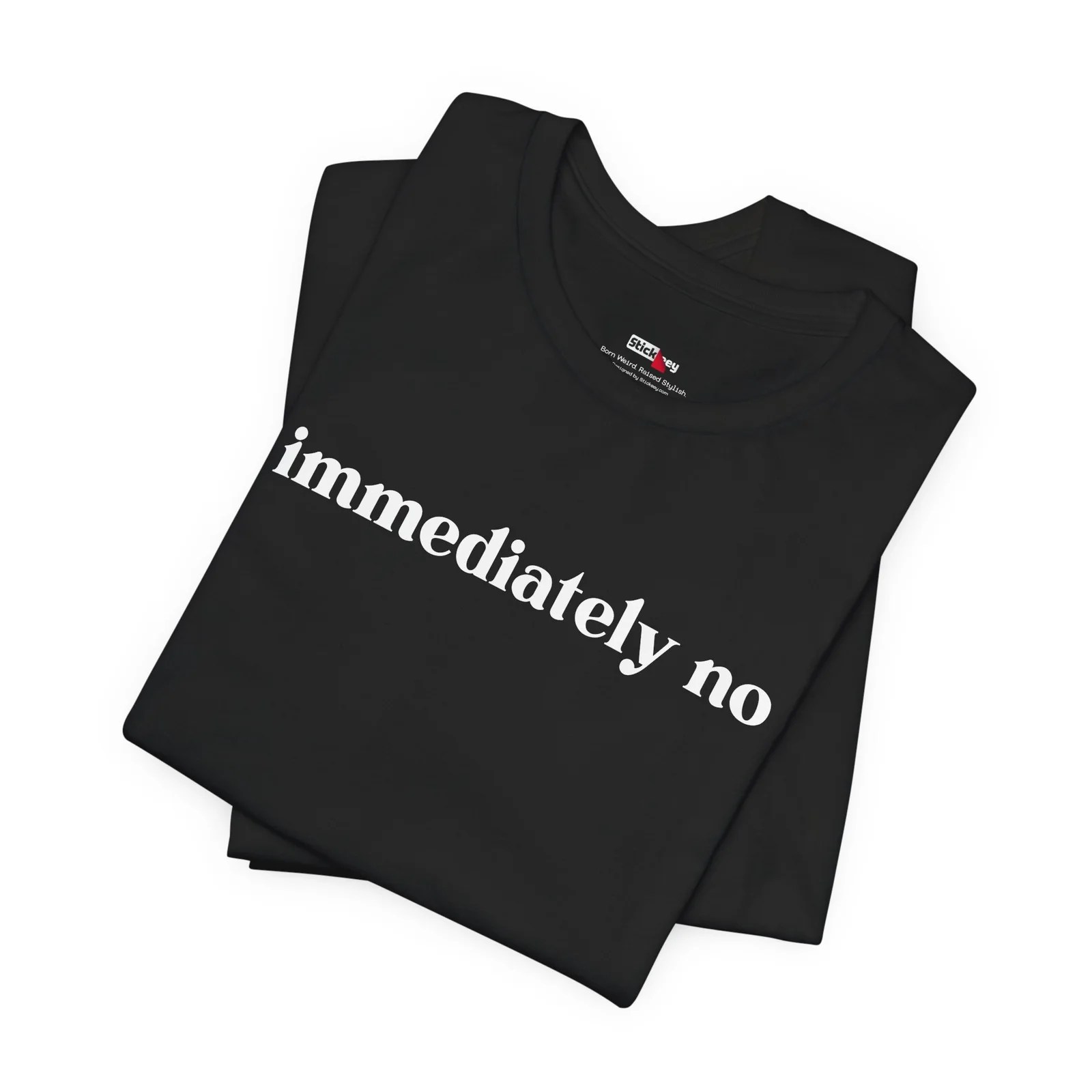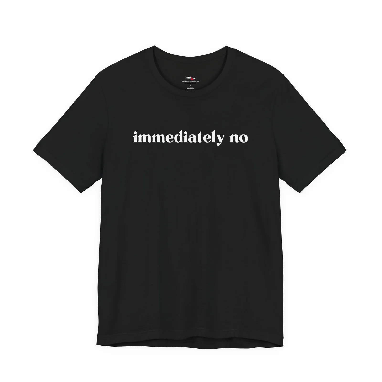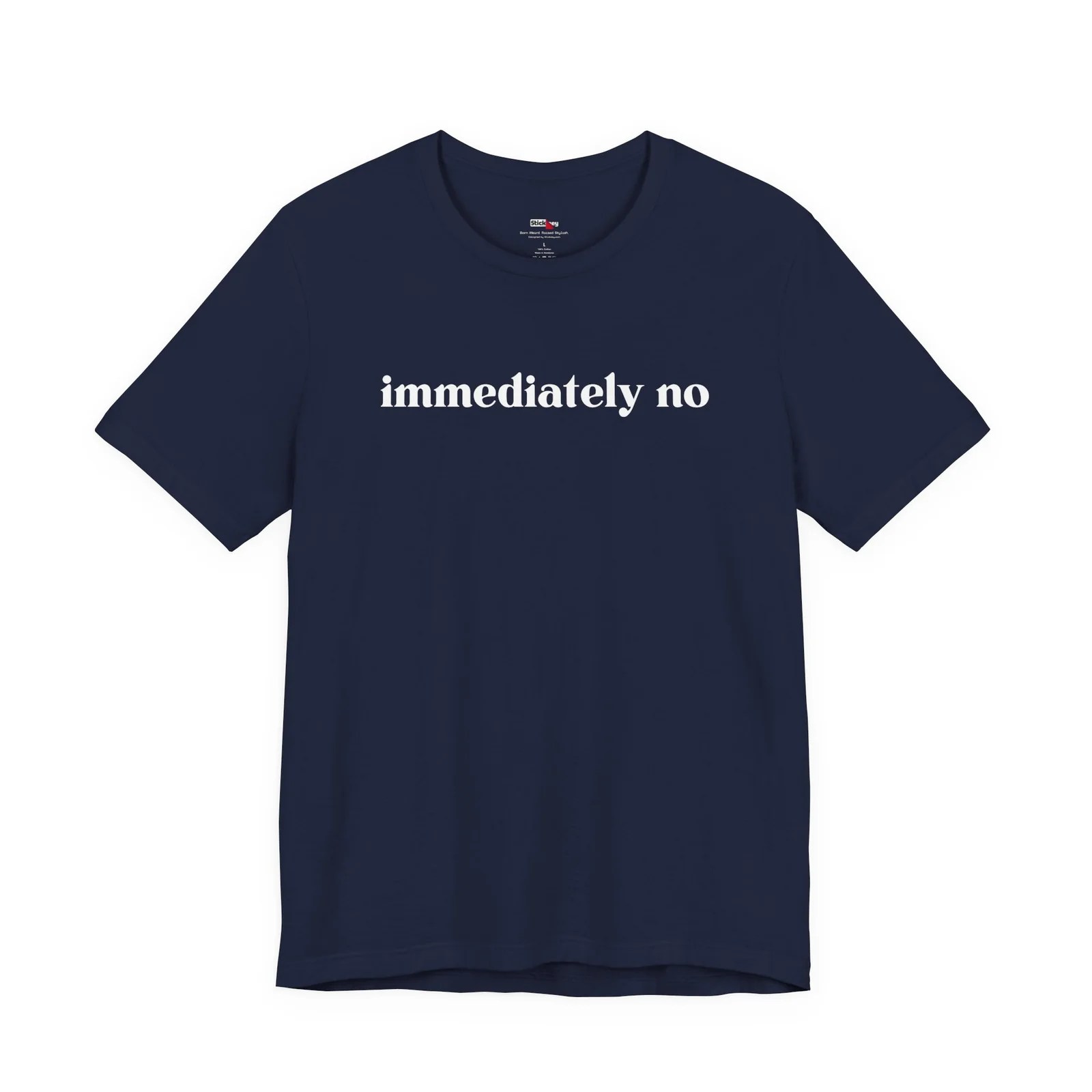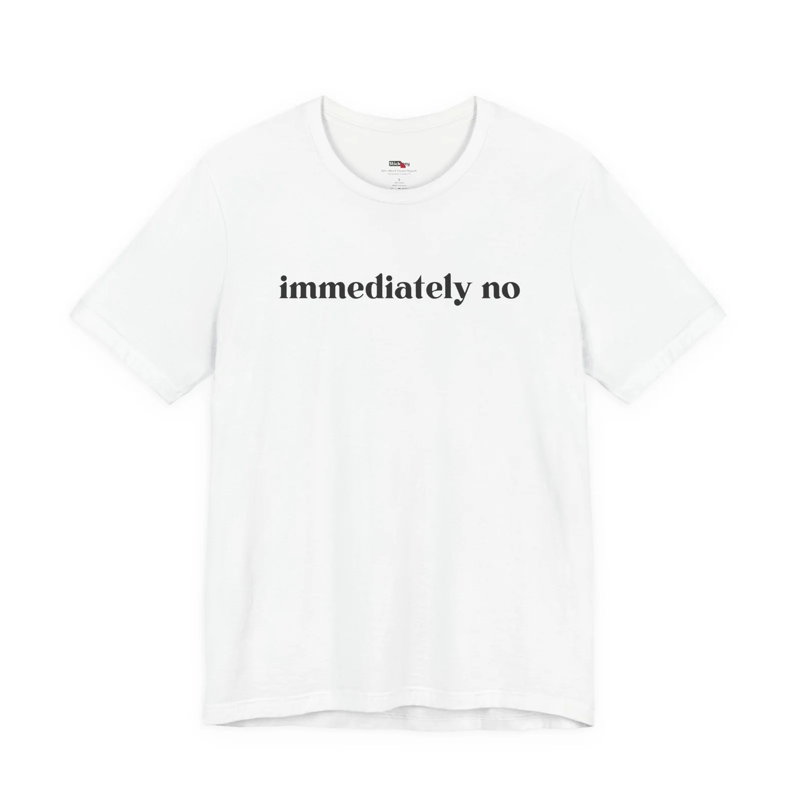 Say it with style and sarcasm in this “Immediately No” funny humor t-shirt. This design makes a quick, bold statement for anyone who rejects nonsense on sight. The relaxed fit and soft cotton keep you comfortable while the humor sparks laughs. Great for casual wear, parties, or gifting to someone who always keeps it real. Perfect for fans of memes, internet humor, and sarcastic fashion.