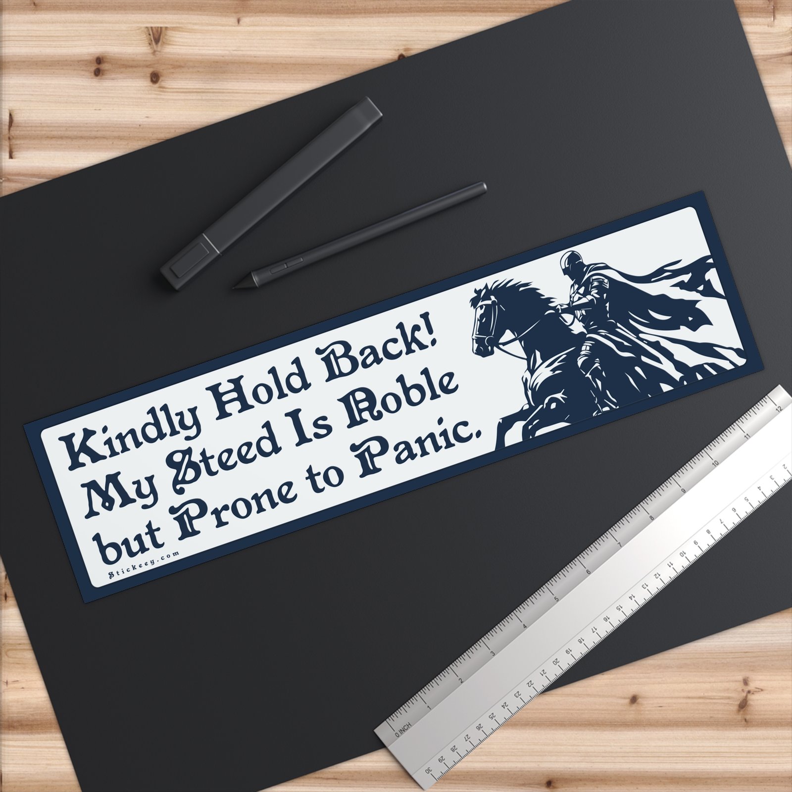 Warn tailgaters with medieval charm and unhinged accuracy. This bumper sticker reads, “Kindly Hold Back! My Steed Is Noble but Prone to Panic.” It’s the perfect mix of absurd fantasy roleplay and modern road rage energy. Whether you’re into DnD, horses, or just chaotic vibes, this sticker lets everyone know you drive with honor… and anxiety. Made from durable, weatherproof vinyl. Sticks strong. Peels clean. Fits cars, laptops, water bottles, and anything else worthy of a noble warning.